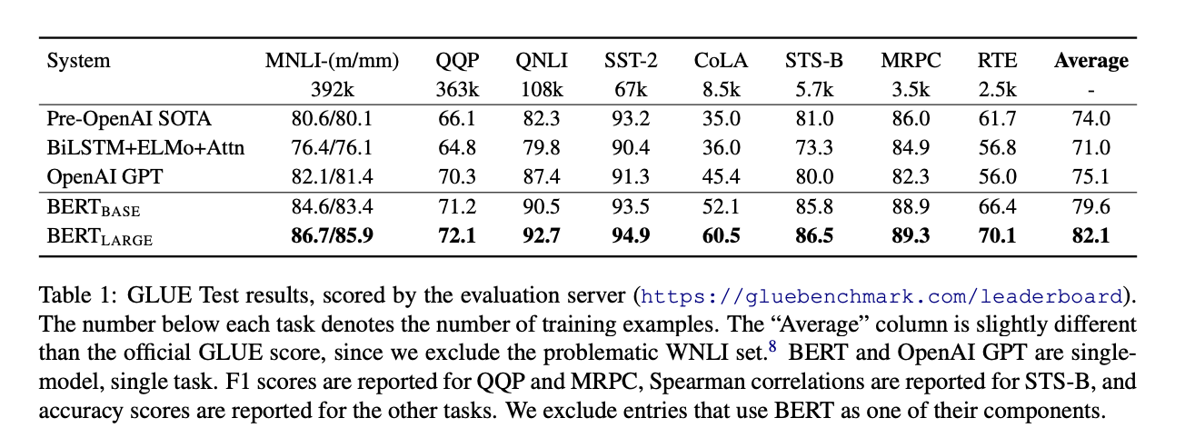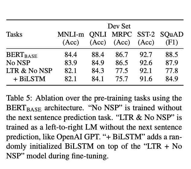 - BiLSTM는 “LTR & No NSP” 모델 위에 무작위로 초기화된 양방향 LSTM을 미세조정 단계에서 추가한 것으로, 특히 문장 관계를 이해하는 데 필요한 작업에서 성능이 향상되지 않았고, 일부에서는 오히려 감소한 것을 볼 수 있습니다 .
