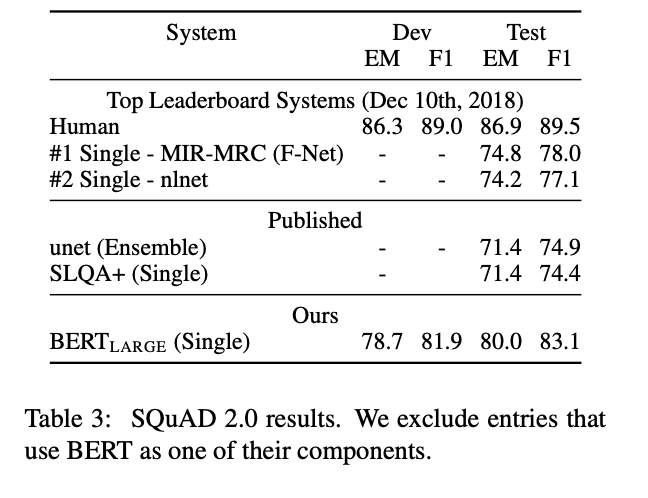 결과적으로, BERT는 이 작업에서 인간의 성능에 근접하거나 심지어는 뛰어넘는 경우도 있습니다. 이는 BERT가 문맥을 깊이 이해하고, 복잡한 자연어 처리 작업을 효과적으로 수행할 수 있음을 보여줍니다.