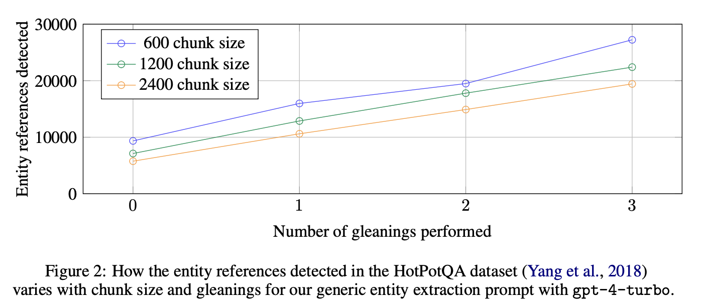 효율성과 품질의 균형을 맞추기 위해 여러 번의 “gleaning” 과정을 거치며, LLM이 이전에 누락한 엔티티를 추가로 감지하도록 유도합니다. 먼저 LLM에게 모든 엔티티가 추출되었는지 여부를 확인하고, 만약 누락된 엔티티가 있다고 답하면 이를 추가로 추출하도록 유도하는 방식입니다. 이를 통해 더 큰 텍스트 청크로도 품질 저하 없이 추출을 할 수 있게 됩니다.