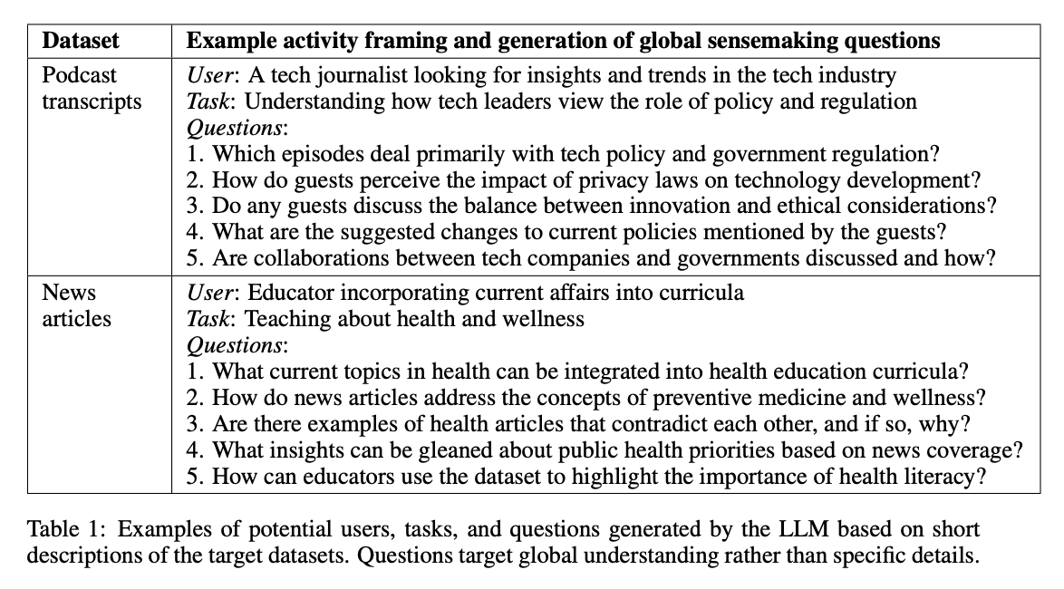 RAG 시스템을 더 글로벌한 의미 형성 작업에 평가하기 위해서는 데이터셋의 세부 사항이 아니라, 전체적인 이해를 요구하는 질문이 필요합니다. 이를 위해 활동 중심 접근법을 사용해 질문을 자동 생성했습니다. 데이터셋에 대한 간략한 설명을 제공하고, LLM에게 N명의 잠재적 사용자와 사용자별 N개의 작업을 식별하게 한 후, 각 사용자-작업 조합에 대해 데이터셋 전체를 이해해야 하는 N개의 질문을 생성하도록 했습니다. 평가를 위해 N=5를 설정해 데이터셋당 125개의 테스트 질문을 생성했습니다. Table 1은 두 평가 데이터셋에 대한 예시 질문을 보여줍니다.
