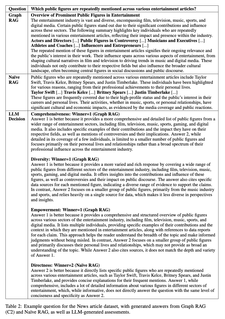 전체 텍스트 코퍼스에서 의미 형성을 지원하기 위해 지식 그래프 생성, RAG, 그리고 질문 중심 요약(QFS)을 결합한 Graph RAG의 글로벌 접근 방식을 제시했습니다. 초기 평가에서는 답변의 포괄성과 다양성 측면에서 단순 RAG 베이스라인보다 상당한 개선을 보였으며, 그래프 없이 소스 텍스트 요약을 수행하는 글로벌 방식과 비교했을 때도 긍정적인 성과를 나타냈습니다. 동일한 데이터셋에 대해 여러 글로벌 질의가 필요한 상황에서 엔티티 기반 그래프 인덱스의 루트 수준 커뮤니티 요약은 단순 RAG보다 우수하며, 적은 토큰 비용으로 다른 글로벌 방법들과 경쟁력 있는 성능을 보여줍니다. 글로벌 및 로컬 그래프 RAG 접근 방식을 모두 구현하는 오픈 소스 Python 기반 구현이 곧 출시될 예정입니다(https://aka.ms/graphrag).