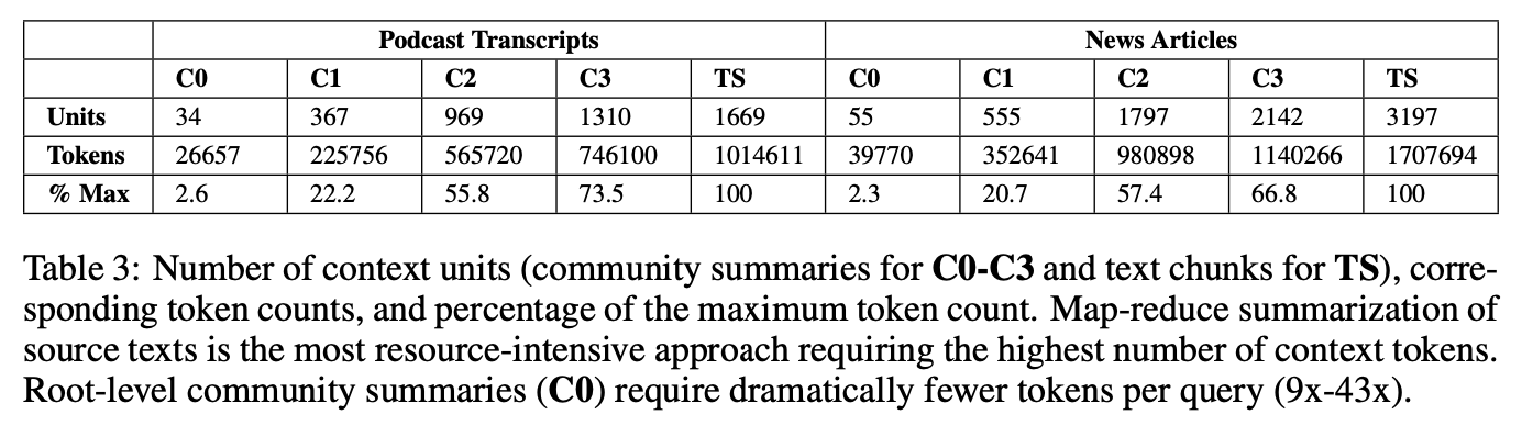 Podcast 데이터셋과 News 데이터셋에 대한 그래프 인덱싱 결과를 보면, 각각 8564개의 노드와 20691개의 엣지, 15754개의 노드와 19520개의 엣지를 가진 그래프가 생성되었습니다. 그래프 커뮤니티 계층에서 다양한 수준의 커뮤니티 요약이 만들어졌으며, Table 3에서 그 수치를 확인할 수 있습니다.