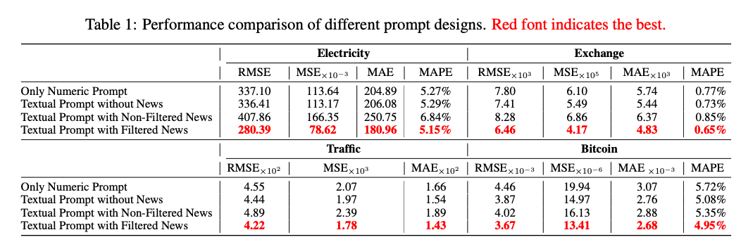 3. 필터링되지 않은 뉴스 + 텍스트 설명문: 시계열의 설명문과 필터링되지 않은 뉴스 데이터를 통합했을 때 모델 성능에 미치는 영향을 평가했습니다.