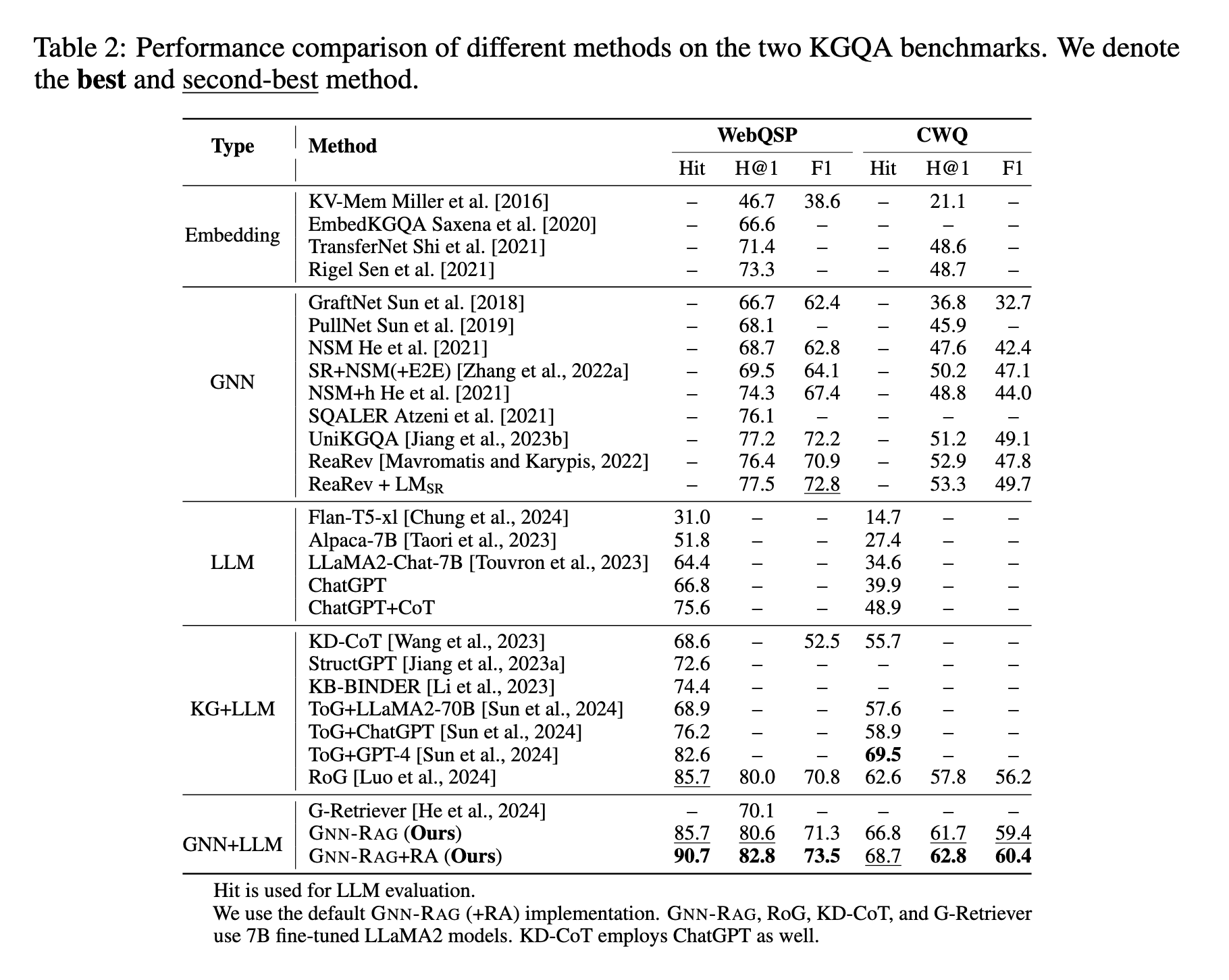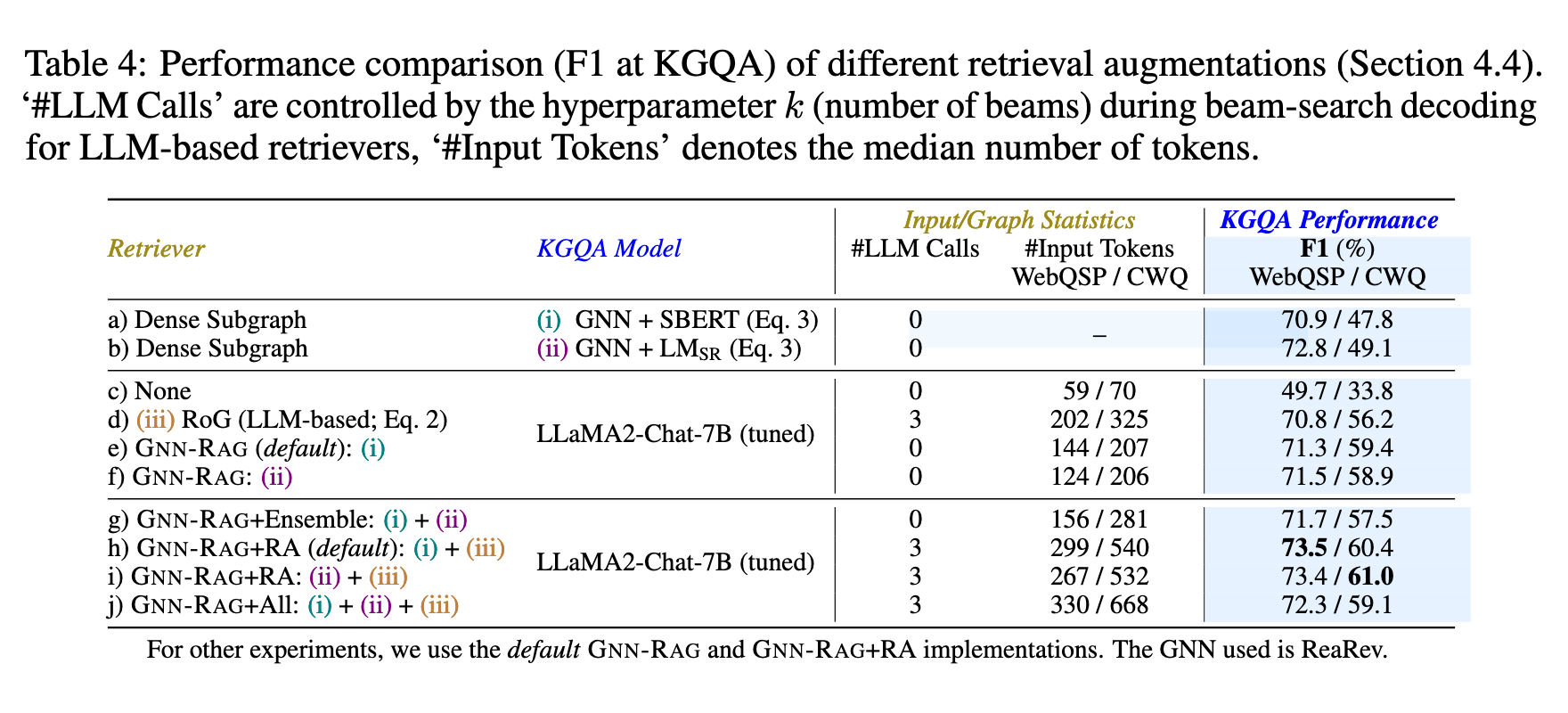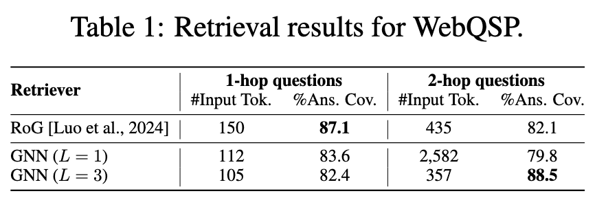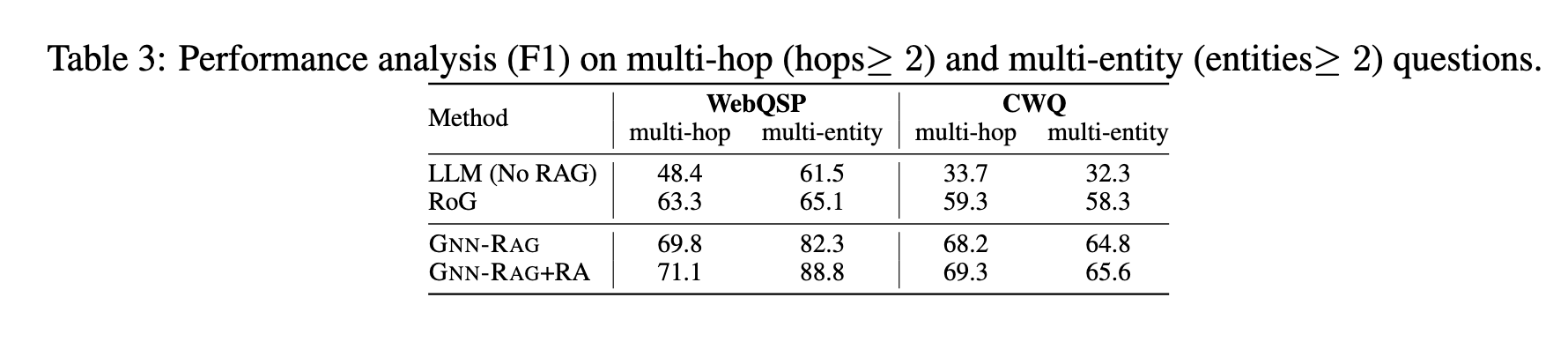 이러한 결과는 GNN-RAG가 GNN의 구조적 추론 능력과 LLM의 언어 처리 능력을 효과적으로 통합하여, KGQA 시스템의 성능을 한 단계 발전시켰음을 보여준다.