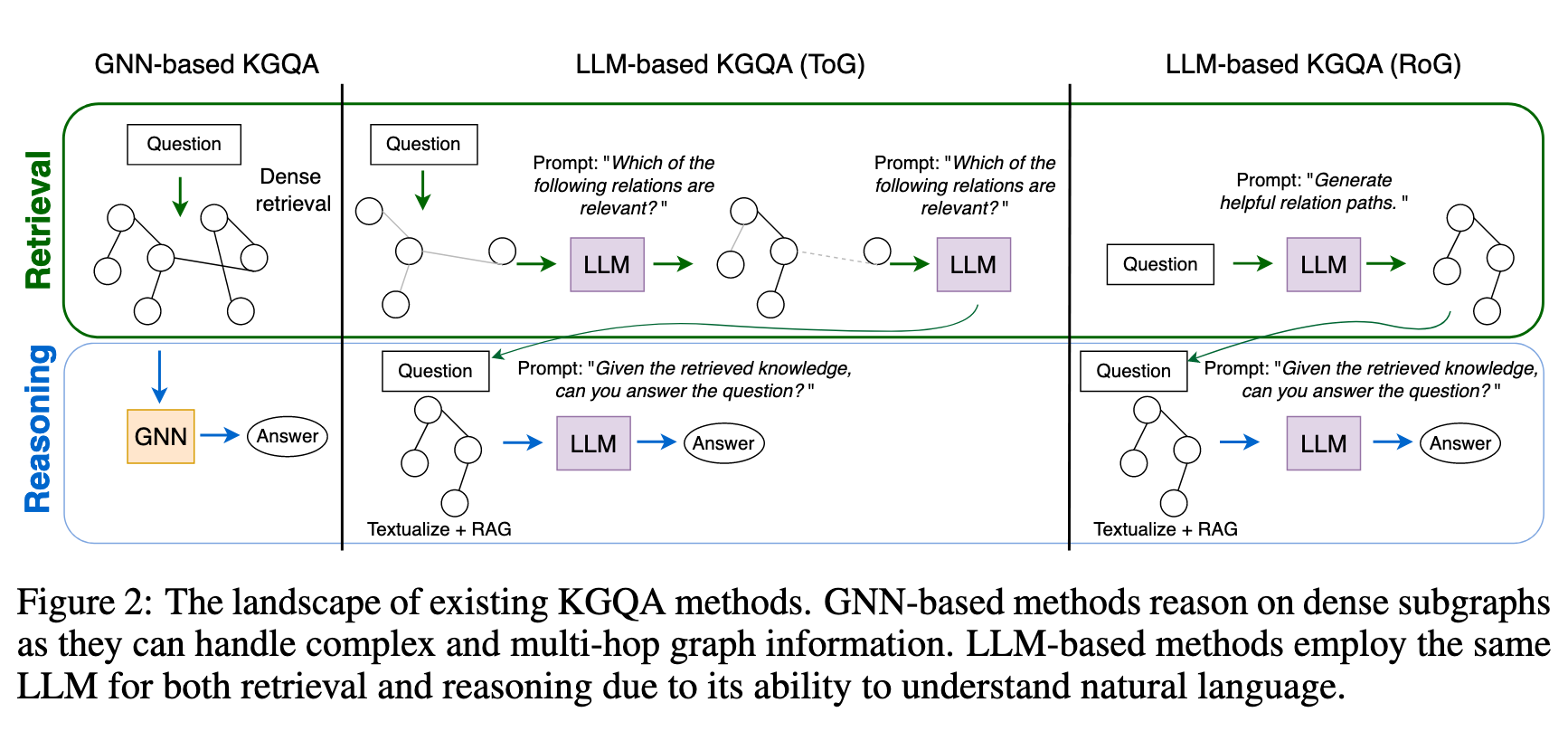 저자들은 이러한 기존 방법들의 분석을 통해 GNN과 LLM의 장점을 결합한 새로운 프레임워크의 필요성을 제기한다. 이는 GNN-RAG가 제안된 이론적 배경이 되며, KGQA 시스템의 성능 향상을 위한 새로운 방향을 제시한다는 점에서 의의가 있다.