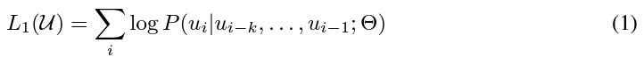 - 수식 (1)은 언어 모델의 목적 함수인 로그 우도(log-likelihood)를 나타냅니다.