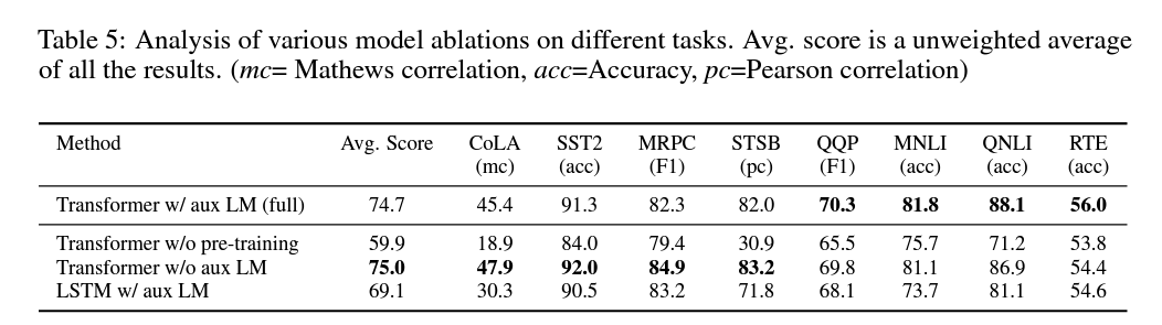 - Fine-tuning 중 auxiliary LM objective의 효과를 분석한 결과, 큰 데이터셋에서는 도움이 되지만 작은 데이터셋에서는 그렇지 않았습니다.