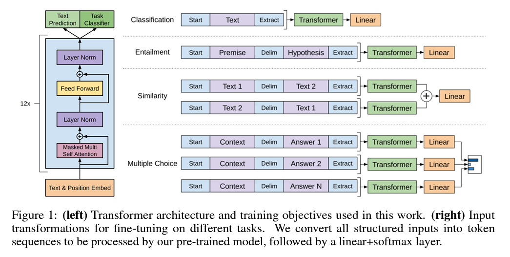 3. 질의응답 및 상식 추론: 문서, 질문, 가능한 답변을 구분자 토큰으로 연결한 시퀀스를 각각 독립적으로 처리한 후, softmax 층을 통해 정규화하여 가능한 답변에 대한 출력 분포를 생성합니다.