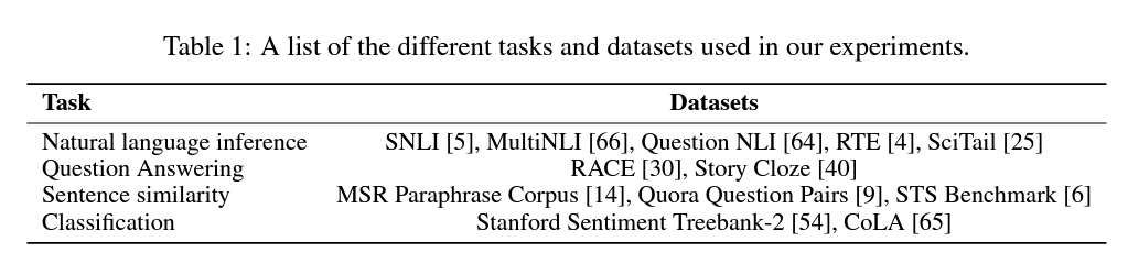 - SNLI, MNLI, QNLI, SciTail, RTE 데이터셋을 사용하여 평가했습니다.