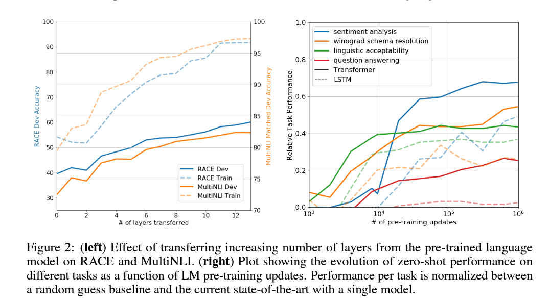 - MultiNLI와 RACE 데이터셋에서 전이되는 layer 수에 따른 성능을 분석했습니다.
