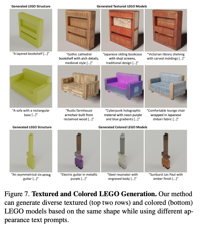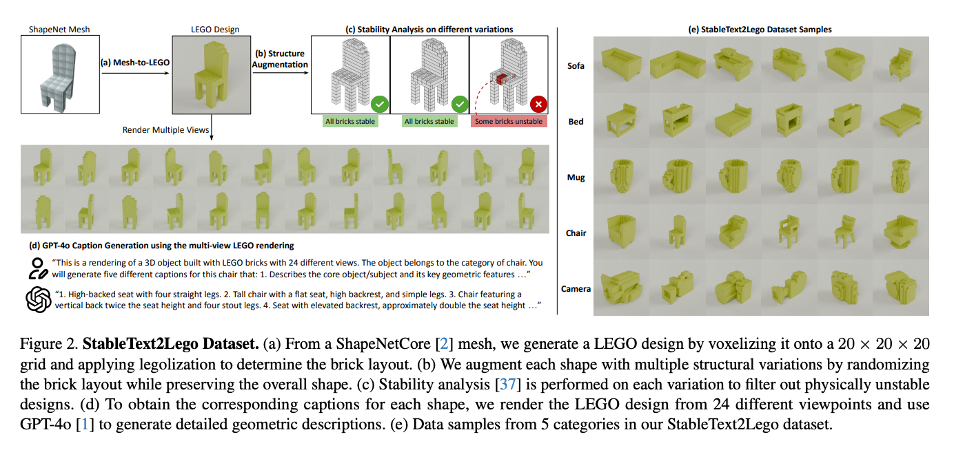 Abstract We introduce LegoGPT, the first approach for generating physically stable LEGO brick models from text prompts. To achieve this, we construct a large-scale, physically stable dataset of LEGO designs, along with their associated captions, and train