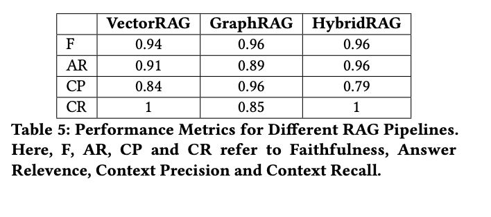 - 문맥 정밀도에서 Graph RAG가 0.96 점으로 가장 우수했으나, 문맥 재현율에서는 Vector RAG및 HybridRAG가 완벽한 1 점을 기록함 .