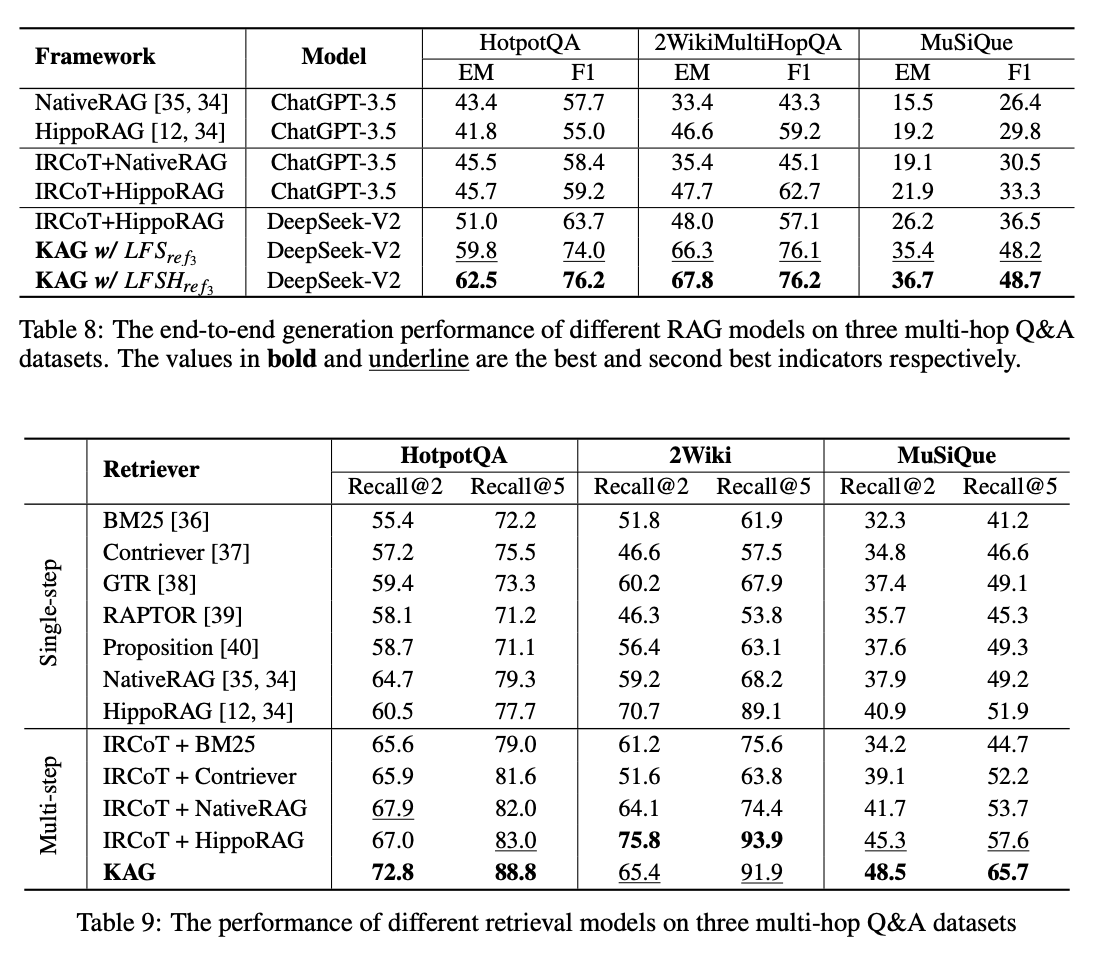 - KAG는 HotpotQA에서 19.6%, 2wiki에서 33.5%의 F1 점수 상대적 개선을 달성하였다.
