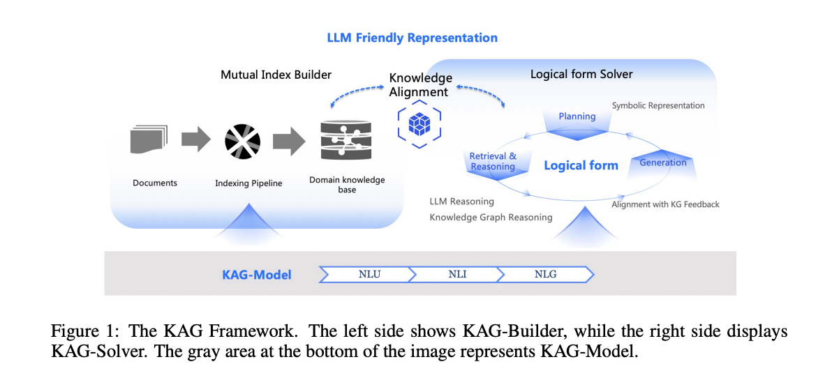 - KAG은 지식 그래프와 대규모 언어 모델(LLM)을 상호 강화하여 성능을 향상시키는 프레임워크이다.