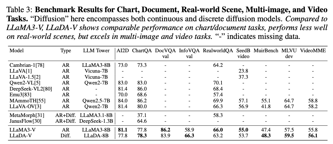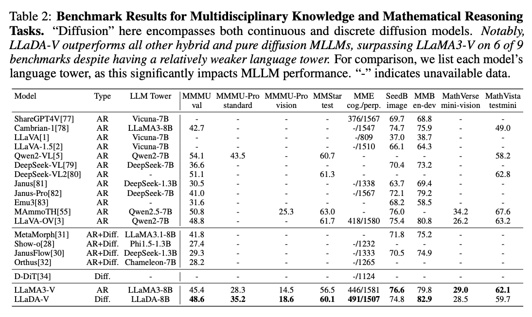 - 논문의 핵심: LLADA(https://arxiv.org/pdf/2502.09992) 팀에서 새로운 멀티모달 모델인 LLaDA-V 제안함.