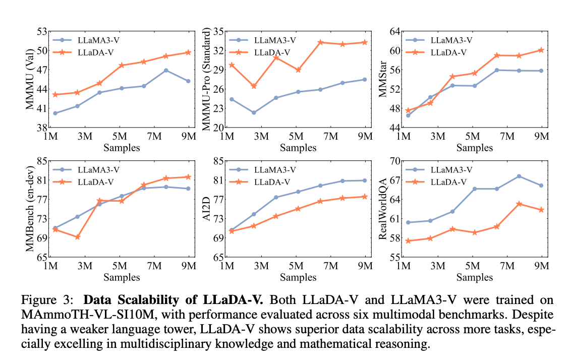 - 데이터가 많아질수록 LLaDA-V는 자기회귀 기반 모델(LLaMA3-V)보다 더 빠르게 성능이 좋아짐. 특히 수학이나 다양한 분야 지식을 요구하는 문제에서 우수함.