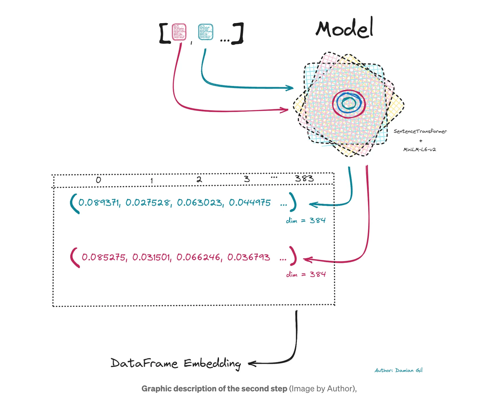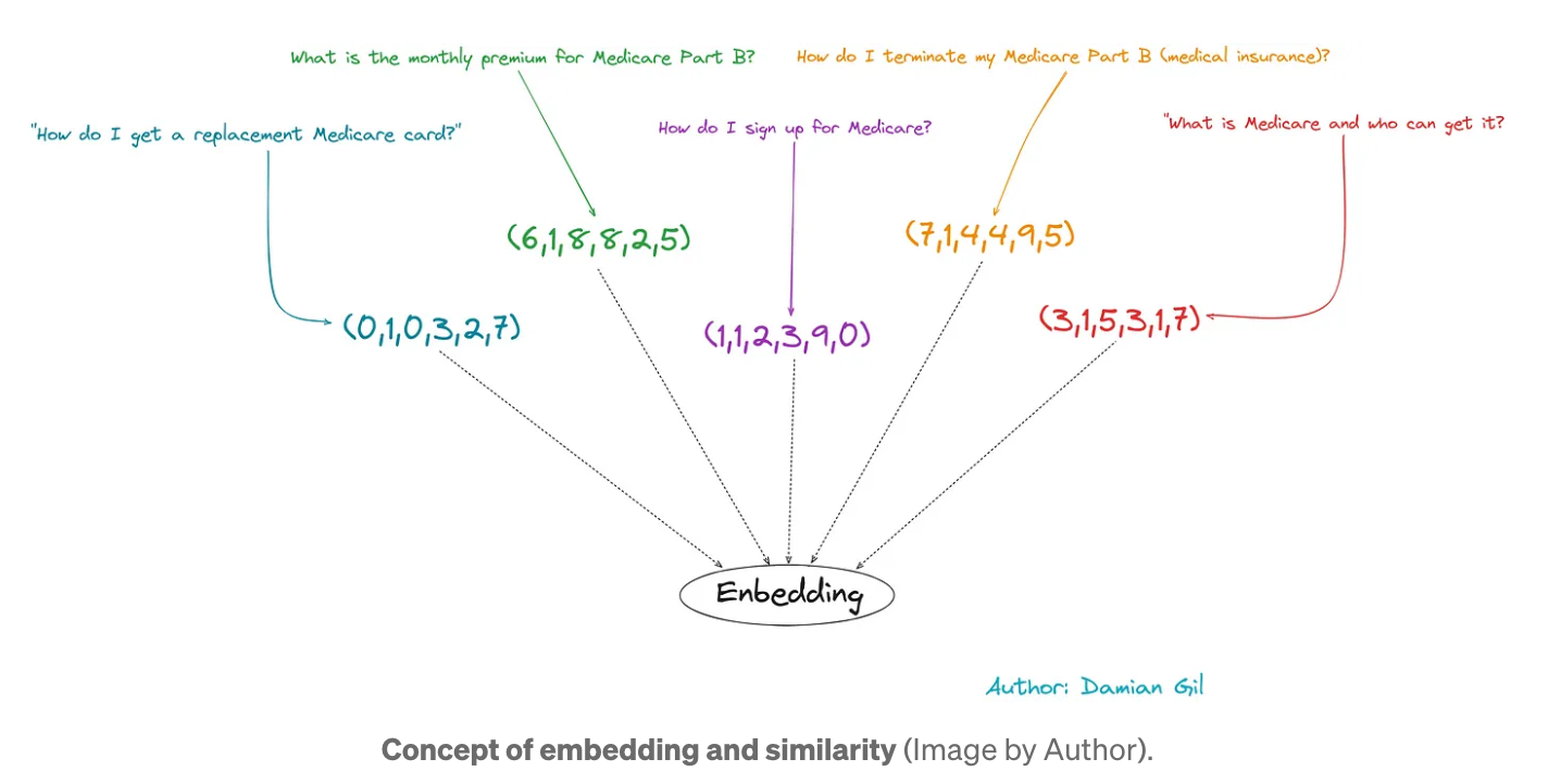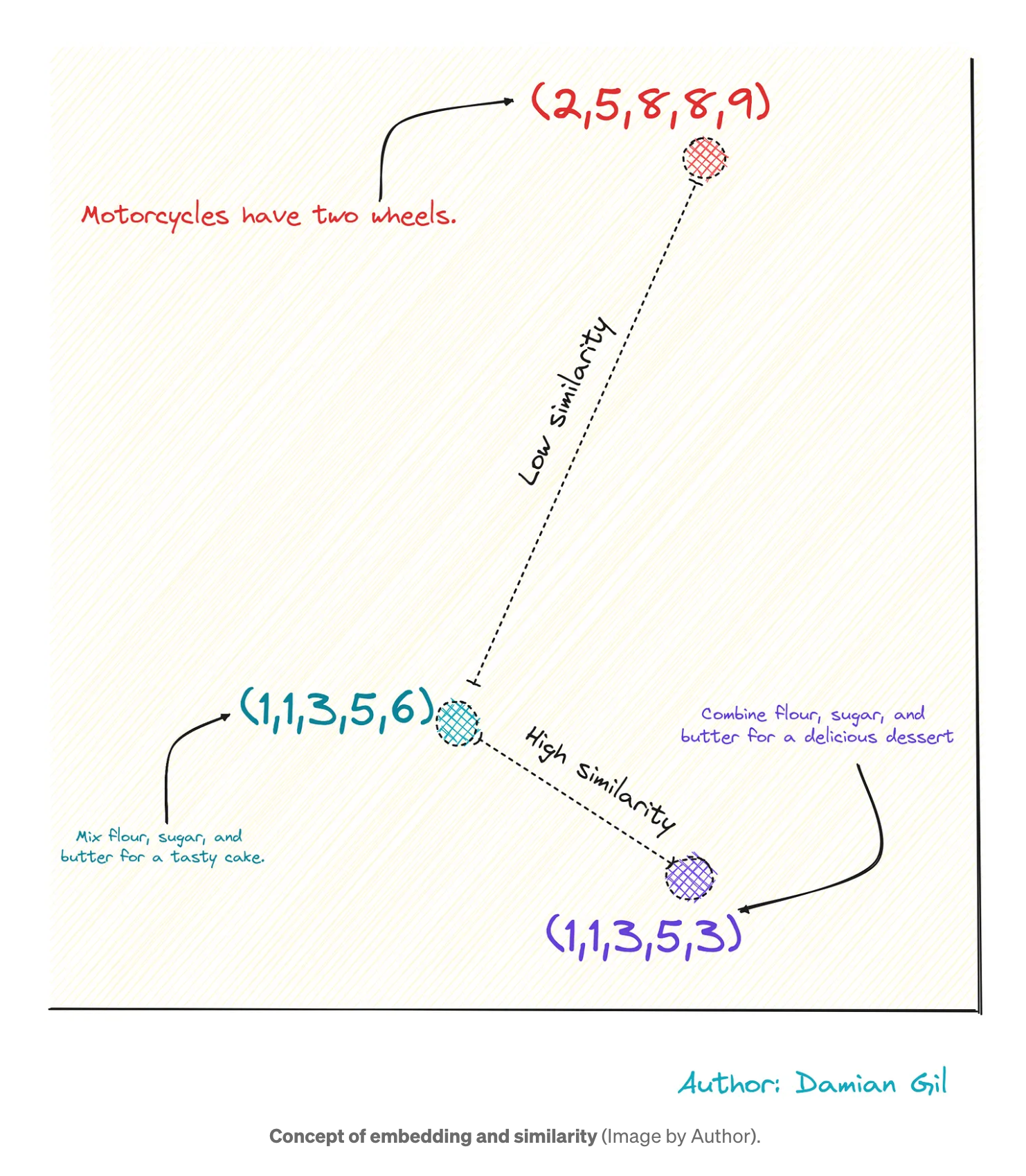 LLM은 서면 텍스트를 직접 이해할 수 없으므로 이러한 유형의 모델 입력을 변환해야 합니다. 이를 위해 문장 임베딩이 수행됩니다. 이는 텍스트를 숫자 벡터로 변환하는 것으로 구성됩니다.