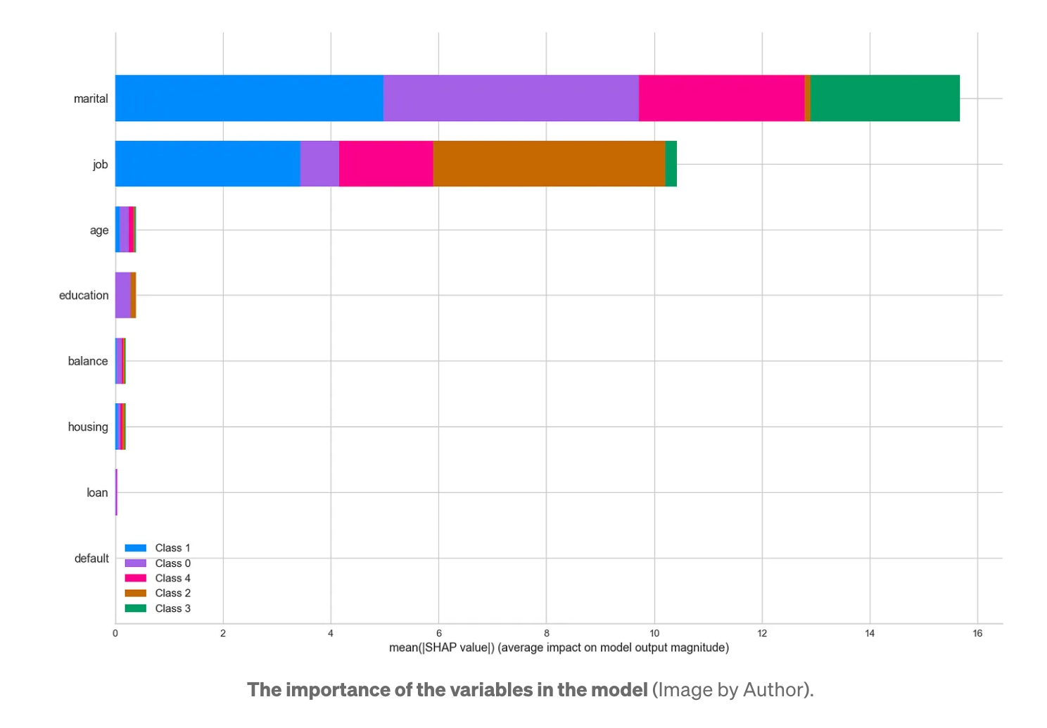 이 모델은 무엇보다도 '결혼'과 '직업' 변수에 기반하고 있음을 알 수 있습니다. 반면에 많은 정보를 제공하지 않는 변수가 있다는 것을 알 수 있습니다. 실제 사례에서는 이러한 변수를 제외하고 정보가 거의 없는 새로운 버전의 모델을 만들어야 합니다.