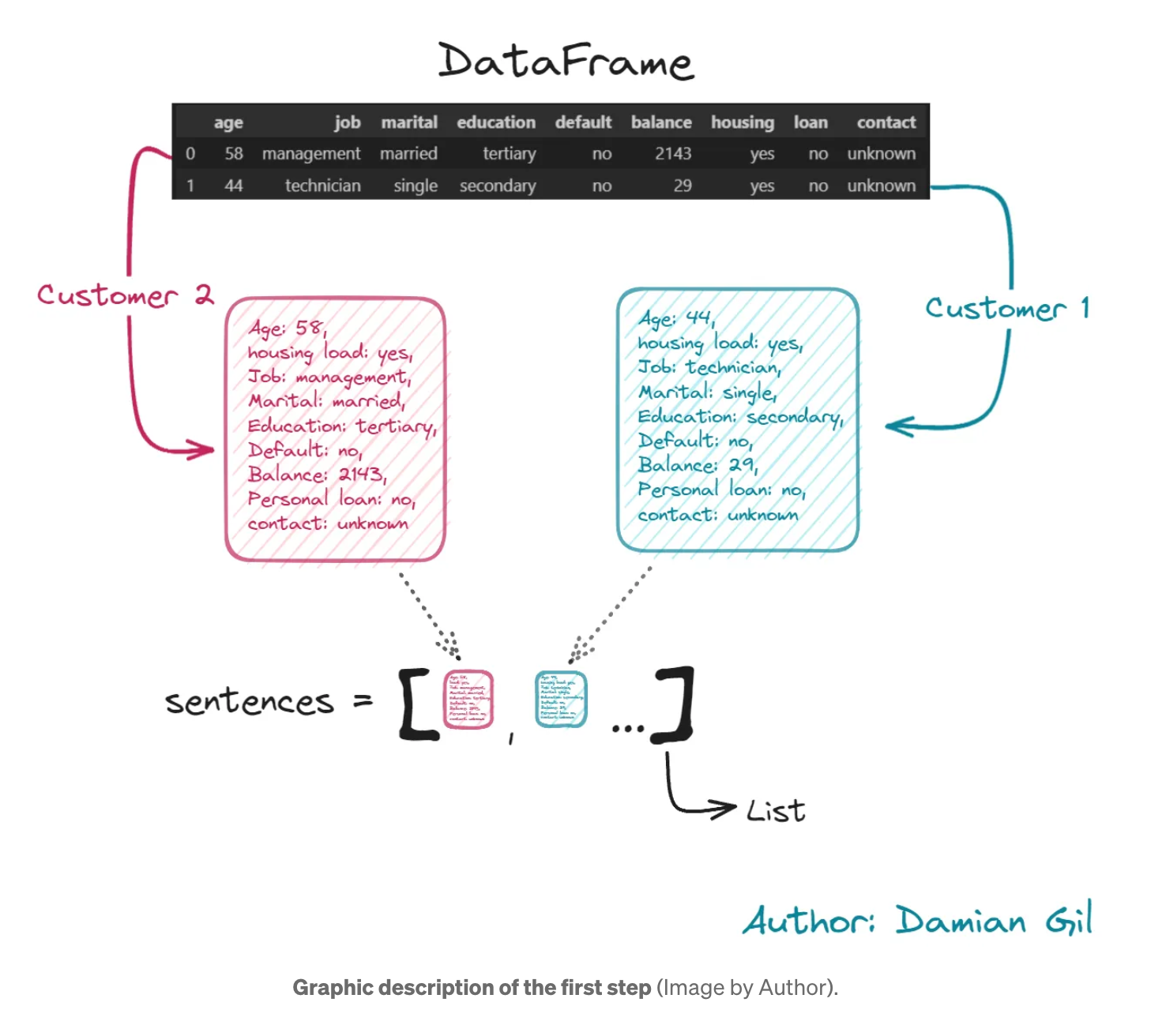 1단계: 전체 고객/행 정보를 포함하는 각 행에 대한 텍스트가 생성됩니다. 또한 나중에 사용할 수 있도록 파이썬 리스트에 저장합니다.
