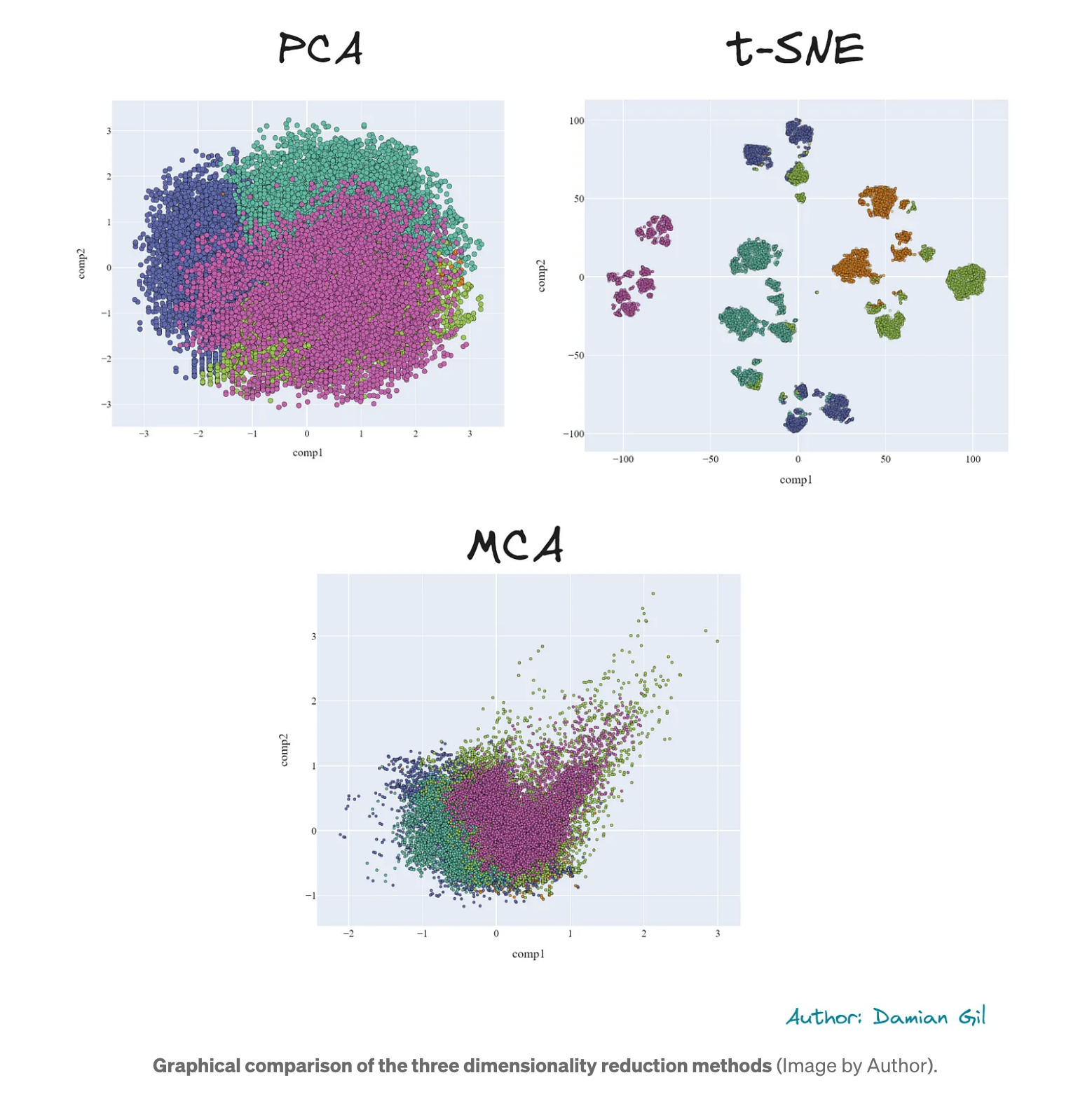 클러스터가 얼마나 조밀한지 시각적으로 확인할 수 있는 한 가지 방법은 3D 표현에서 포인트의 불투명도를 수정하는 것입니다. 즉, 포인트가 특정 공간에 모여 있으면 검은 점이 관찰될 수 있습니다. 두 번째 차원 축소 방법을 사용하여 얻은 개선이 눈에 띕니다. 2D 비교를 살펴보겠습니다.