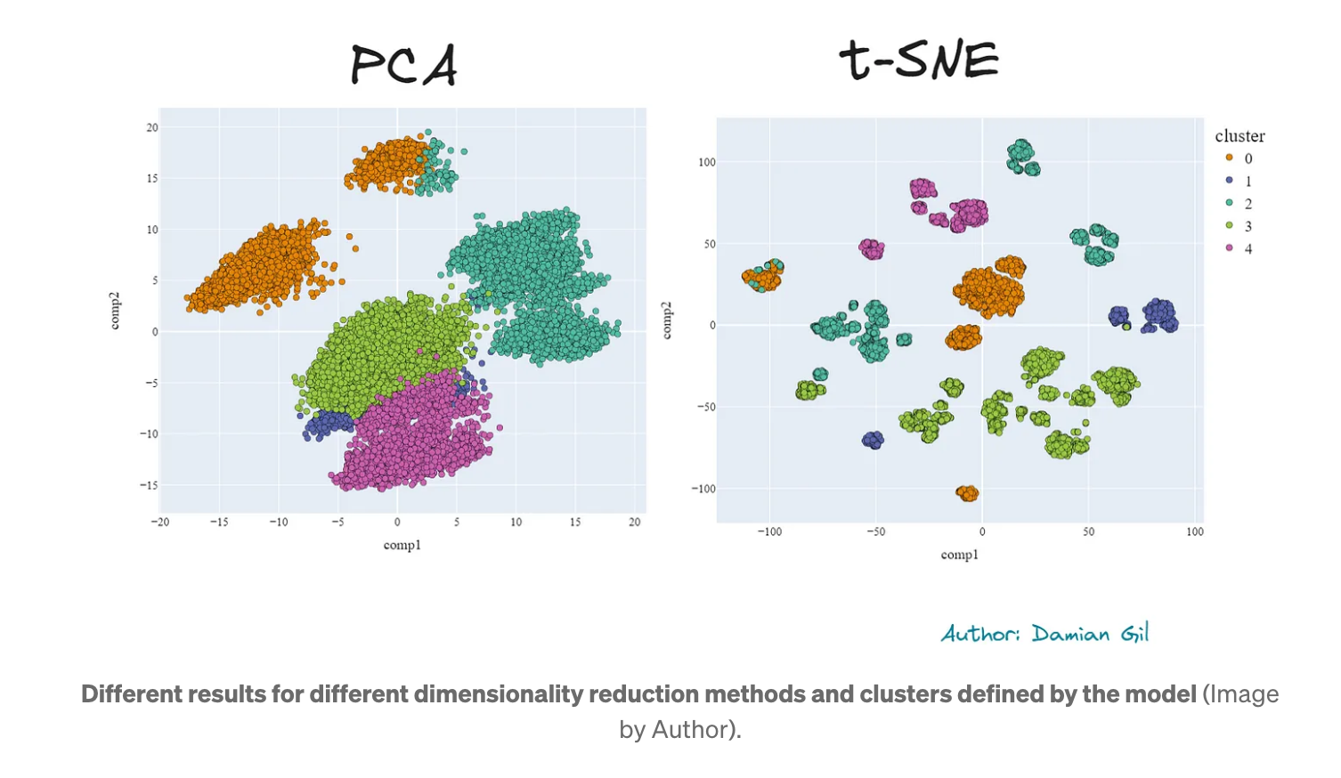 다시 말하지만, t-SNE의 클러스터가 PCA보다 더 분리되고 더 잘 구분되는 것을 볼 수 있습니다. 또한 품질 측면에서 두 방법의 차이는 기존의 Kmeans 방법을 사용할 때보다 더 작습니다.