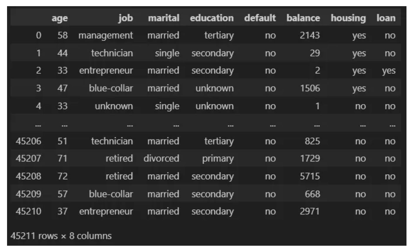 - job: 직업 유형 (범주형: "admin.", "unknown", "unemployed", "management", "housemaid", "entrepreneur", "student", "blue-collar", "self-employed", "retired", "technician", "services")