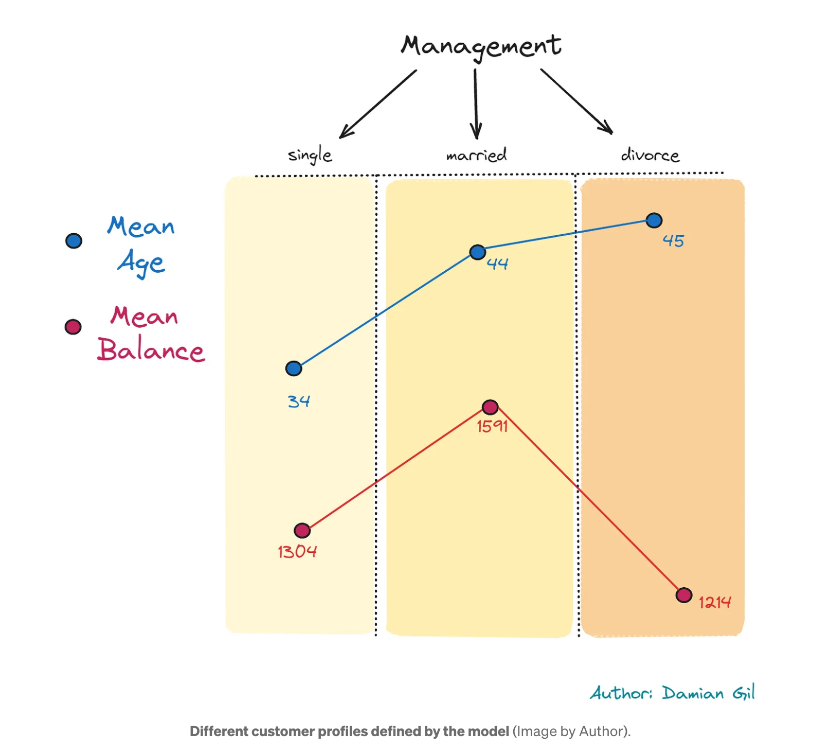 매우 흥미로운 점은 '관리자' 직책이 가장 많은 클러스터가 3개라는 점입니다. 여기서 우리는 독신 관리자는 젊고, 기혼자는 나이가 많고, 이혼자는 나이가 많다는 매우 특이한 행동을 발견할 수 있습니다. 반면에 잔액은 다르게 행동하여 미혼자는 이혼한 사람보다 평균 잔액이 더 높고 기혼자는 평균 잔액이 더 높습니다. 말씀하신 내용은 다음 이미지로 요약할 수 있습니다.