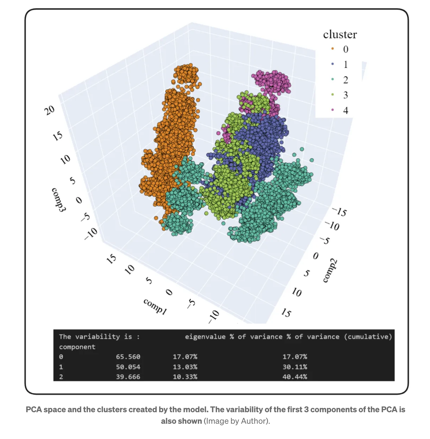클러스터가 기존 방식보다 훨씬 더 잘 차별화되는 것을 볼 수 있습니다. 이것은 좋은 소식입니다. PCA 분석의 처음 세 가지 구성 요소에 포함된 변동성을 고려하는 것이 중요하다는 점을 기억하세요. 경험상 약 50%(3D PCA)가 되면 어느 정도 명확한 결론을 도출할 수 있다고 말할 수 있습니다.