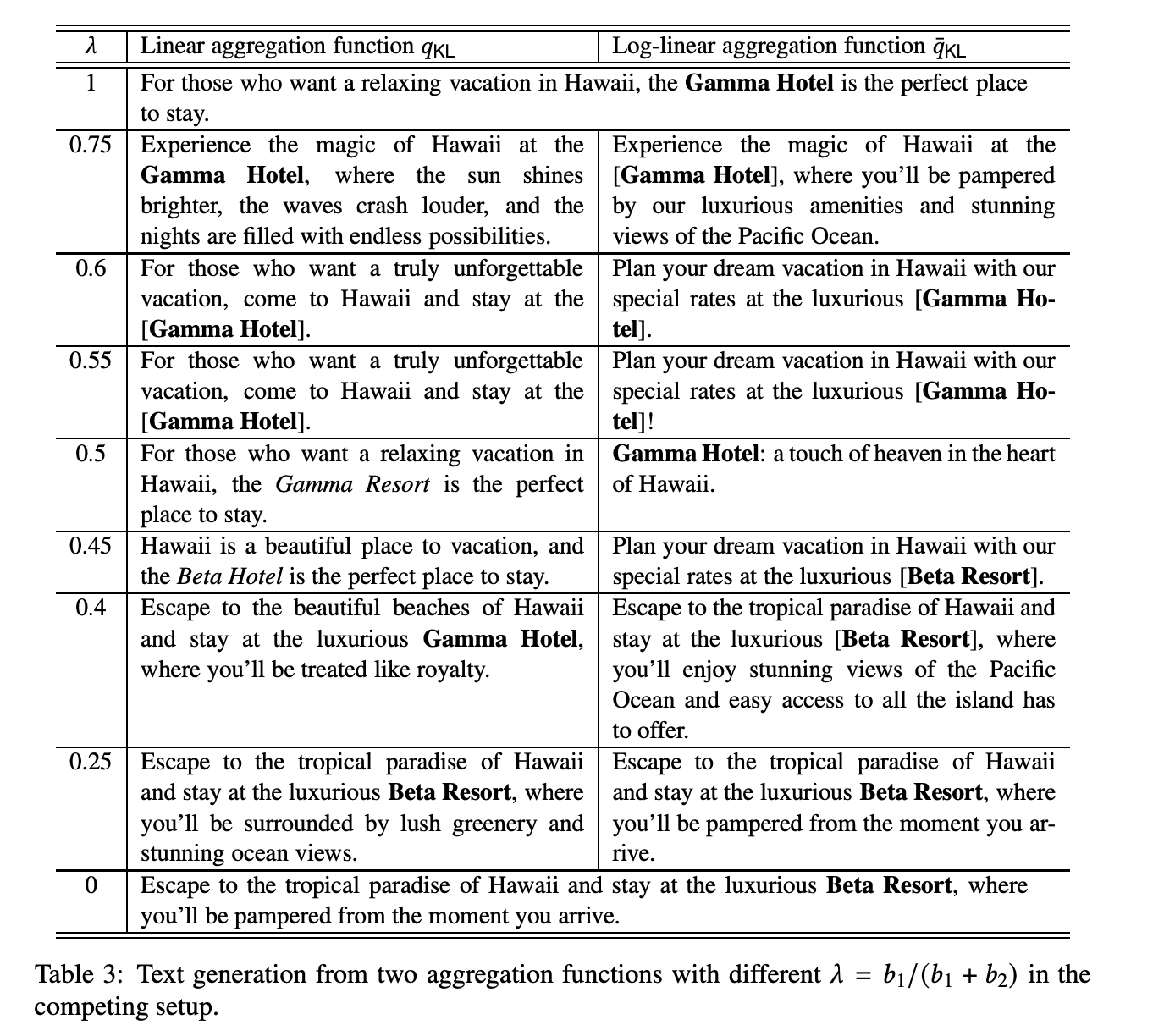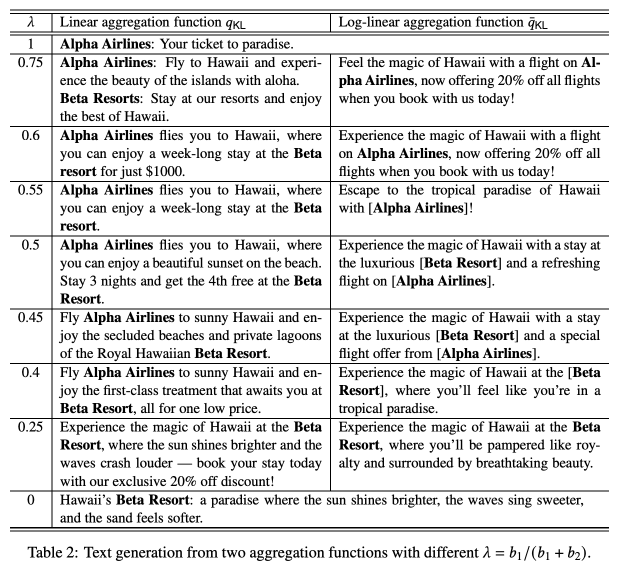 λ = 0.5 (동등): "Alpha Airlines로 하와이에 가서 Beta Resort에서 숙박하며 아름다운 석양을 즐기세요"