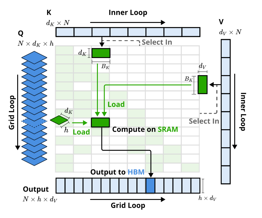 녹색 블록은 SRAM에 있는 데이터, 파란색은 HBM에 있는 데이터를 나타냄