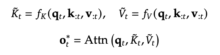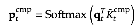 각 쿼리 토큰  q_t  이 이전의 모든 키  k_{1:t}  와 비교하여 관련성 점수(relevance scores)를 계산한 후,