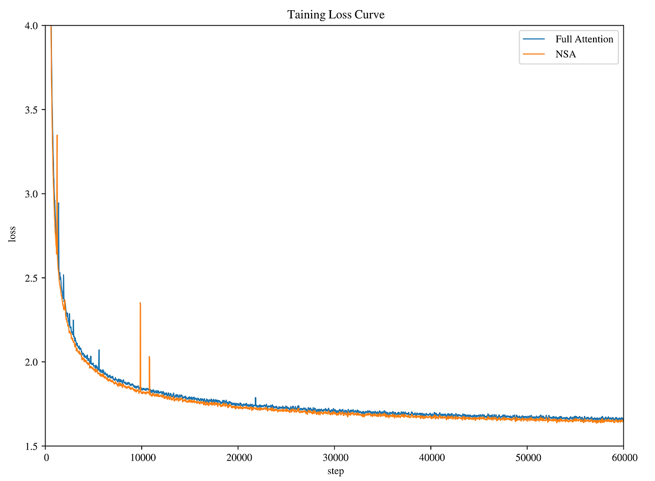 - 즉, NSA가 더 효율적으로 학습하고 더 좋은 성능을 보였다는 의미