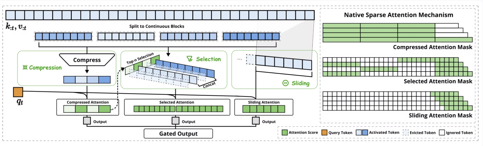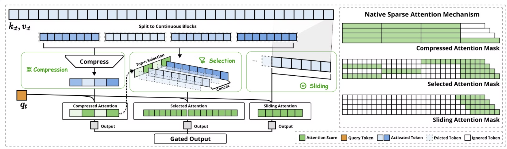 NSA는 처음부터 희소성을 고려하여 설계된(natively sparse) 어텐션 프레임워크로,