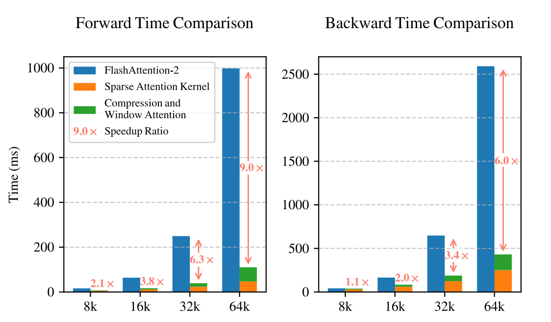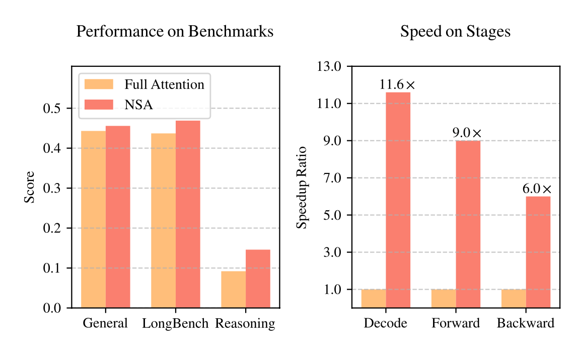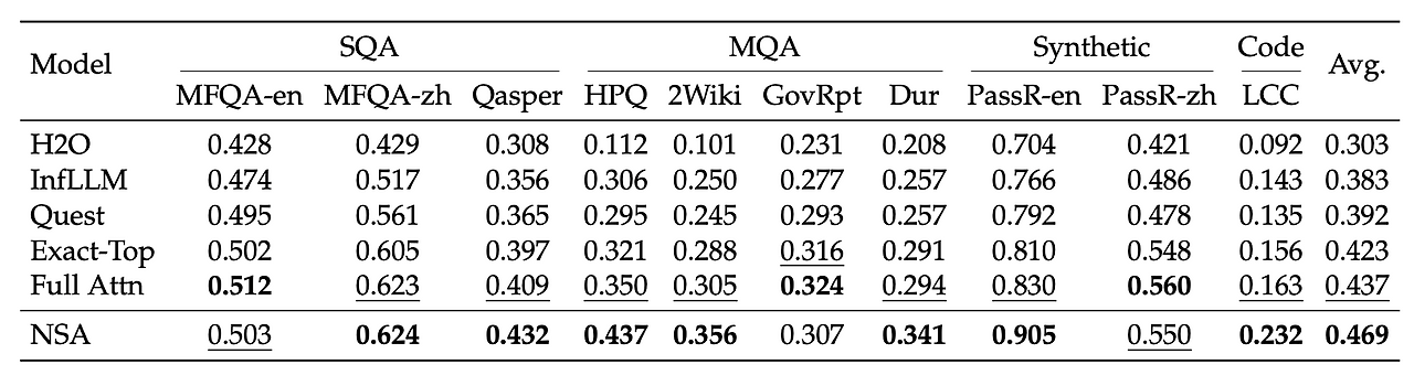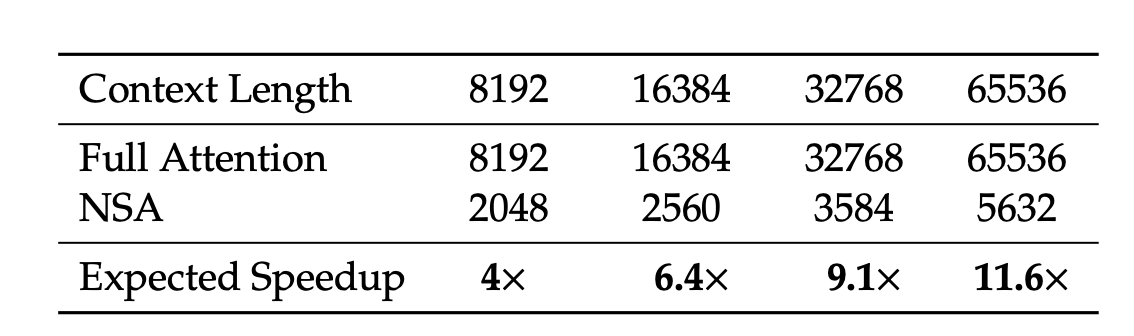 즉, NSA는 긴 문맥을 처리할 때 성능과 연산 효율성을 모두 잡은 새로운 희소 어텐션 방식임이 입증되었다.