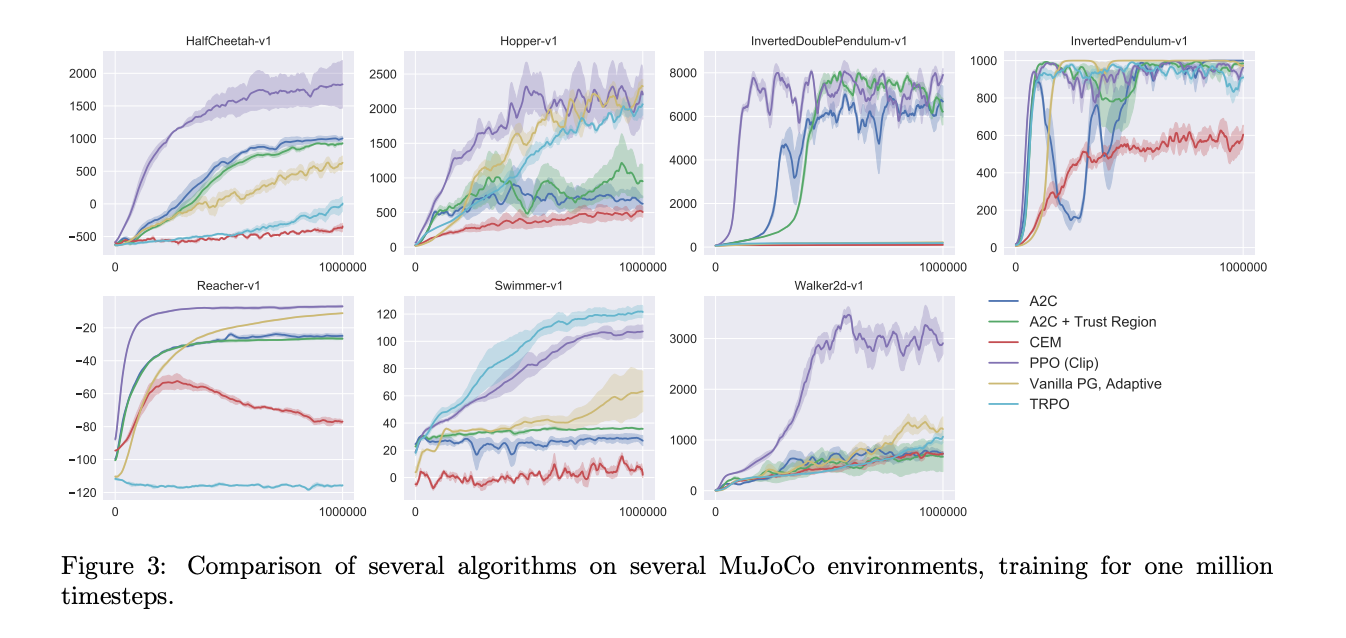 요약하면 이 비교 실험은 PPO가 연속적인 제어 태스크에서 기존의 다른 알고리즘들에 비해 우수한 성능을 보임을 시사합니다.