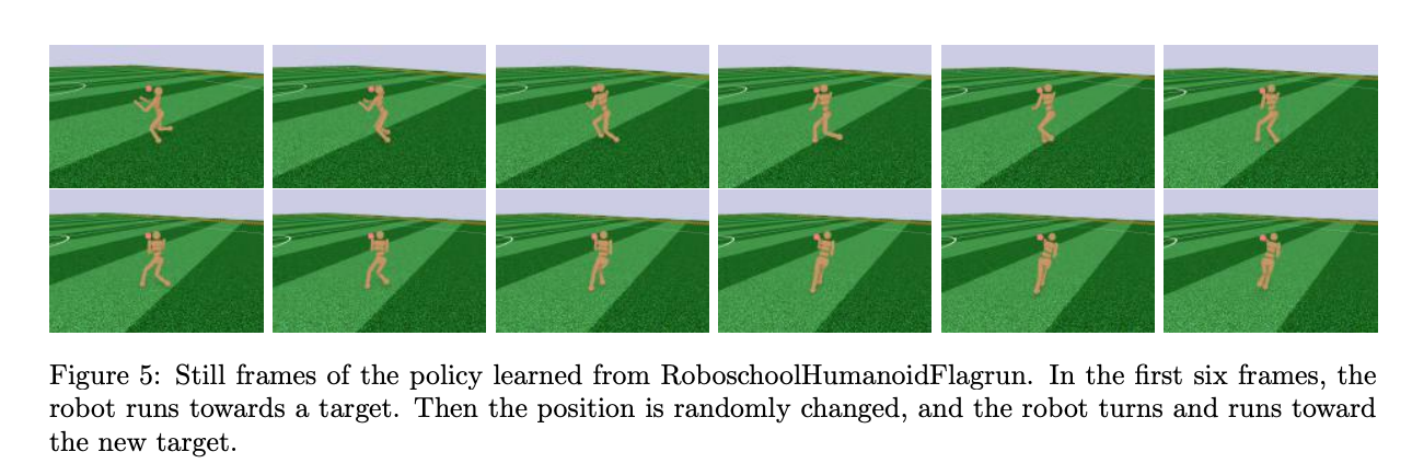 Figure 5는 RoboschoolHumanoidFlagrun에서 학습된 정책으로부터의 스틸 프레임을 보여줍니다. 처음 6 프레임에서는 로봇이 달리는 것을 보여주고, 이후 6 프레임에서는 로봇이 새로운 목표를 향해 방향을 바꾸고 달리는 모습을 볼 수 있습니다.