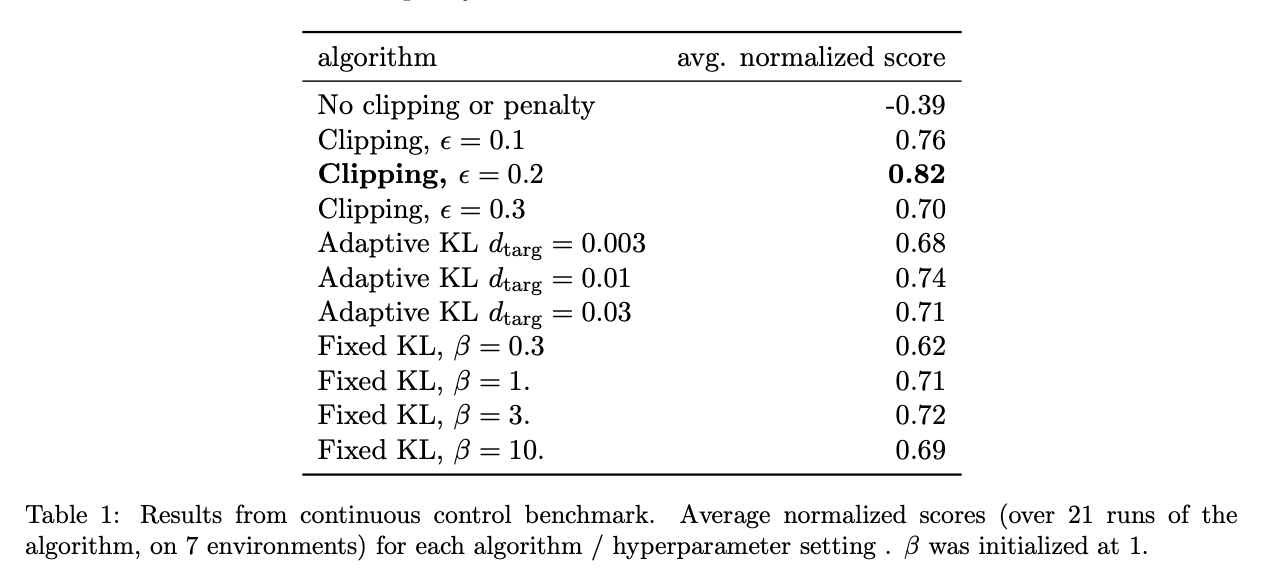 또 다른 접근 방식은 클리핑된 대리 목적 함수와 함께 사용하거나 대안으로 사용할 수 있는 KL 발산에 대한 패널티를 사용하는 것입니다. 이 방식에서는 KL 발산 패널티 계수를 적응적으로 조정하여 각 정책 업데이트에서 어떤 목표 KL 발산 d_targ을 달성하도록 합니다. 실험에서 KL 패널티가 클리핑된 대리 목적 함수보다 성능이 좋지 않았지만, 중요한 기준선이므로 여기에 포함시켰습니다.