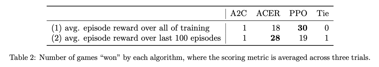 전체 학습 기간 동안의 평균 보상을 보면, PPO가 30개 게임에서 승리하여 A2C (1개)와 ACER (18개)를 크게 앞섰습니다. 마지막 100 에피소드만 보면 ACER가 28개로 PPO (19개)보다 더 많은 게임에서 이겼지만, 두 메트릭 모두에서 PPO는 A2C보다 우수한 성능을 보였습니다.