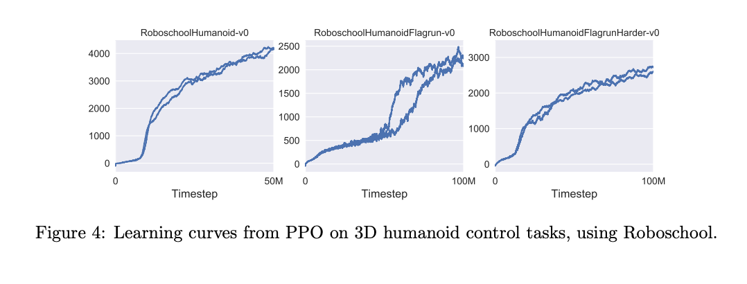 이 실험은 PPO가 복잡한 3D 휴머노이드 제어 작업들을 성공적으로 학습할 수 있음을 보여줍니다.