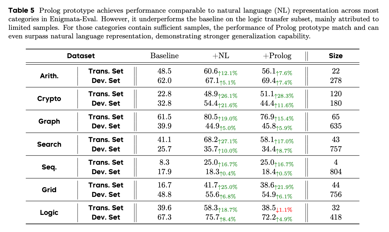 - 기준선 + Prolog 표현 (방법 2): Enigmata 추론 문제의 공식화된 Prolog 표현으로 보강된 표준 데이터셋으로 훈련된 모델