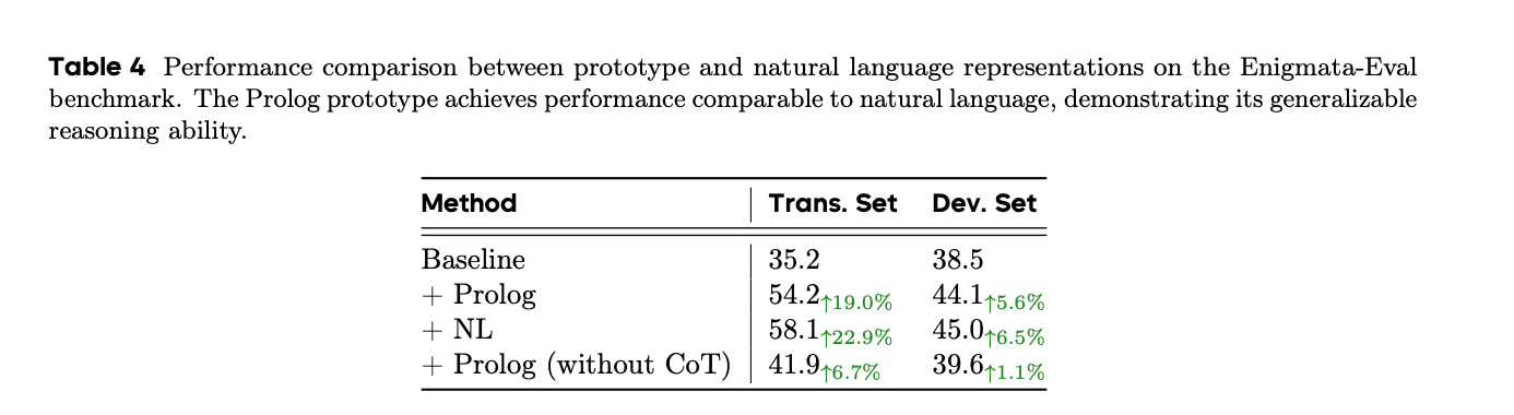 결과 및 분석: 표 4는 Prolog 표현이 전이 세트와 개발 세트 모두에서 상당하고 일관된 성능 향상을 가져온다는 것을 보여줍니다. 기준선에 대한 기준선 + Prolog 표현(방법 2)의 성능 향상은 프로토타입 표현에서의 훈련이 자연어 문제로 효과적으로 일반화된다는 것을 검증합니다.