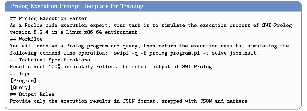 앞 섹션에서 설명한 프로토타입 변환을 바탕으로, 모든 참조 답변 A를 구조화된 JSON 딕셔너리로 제한했습니다. 그런 다음 모델이 동일한 JSON 형식으로 예측 Aˆ를 생성하도록 지시하는 훈련 프롬프트 템플릿을 개발했습니다. 이러한 표준화는 Prolog 해석기의 출력과 모델 예측 간의 엄격한 평가를 용이하게 하여 둘 다 일관된 형식으로 표현되도록 보장합니다.