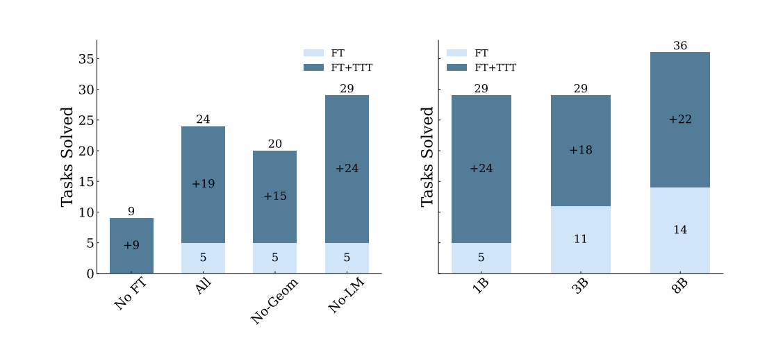• TTT를 ARC 데이터셋에 적용한 결과, 모델 성능이 크게 향상되었습니다.