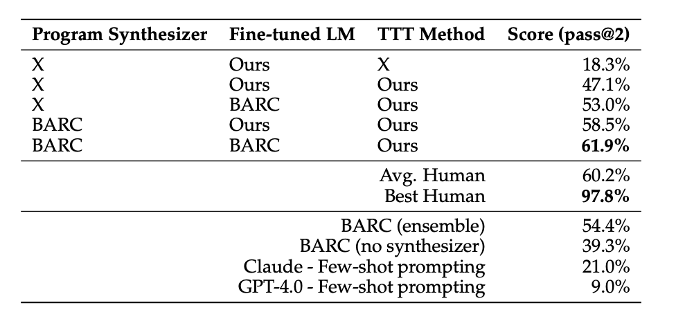 • BARC와 같은 프로그램 생성 접근법과 TTT를 결합하면 ARC 데이터셋에서 61.9% 정확도를 달성