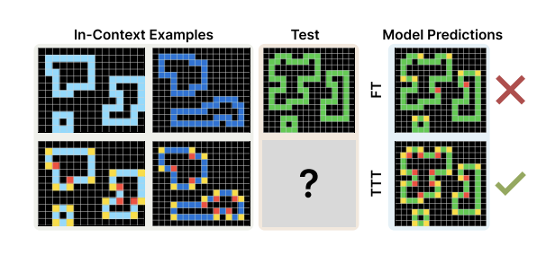 언어 모델은 훈련 데이터 내의 작업에서는 뛰어난 성능을 보이지만, 복잡한 추론이 필요한 새로운 문제에서는 종종 어려움을 겪습니다. 우리는 테스트 시점 학습(Test-Time Training, TTT)을 사용하여 모델의 추론 능력을 향상시키는 방법을 연구했습니다. TTT란 추론(모델 예측)을 수행하는 동안 입력 데이터를 기반으로 한 손실(loss)을 이용해 모델의 파라미터를 임시로 업데이트하는 기법입니다. 이 연구에서는 추상적 추론 데이터셋(ARC, Abstraction and Reasoning Corpus)을 벤치마크로 사용하여 TTT의 효과를 평가했습니다.