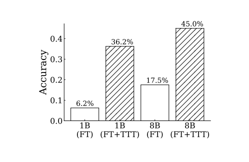 • TTT 적용 후 1B와 3B 모델의 성능이 8B 모델과 유사해짐: