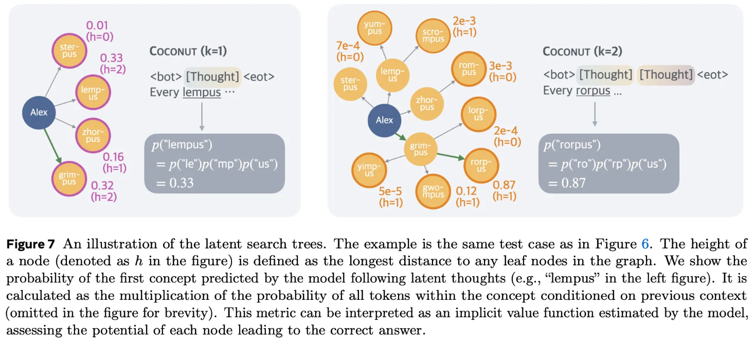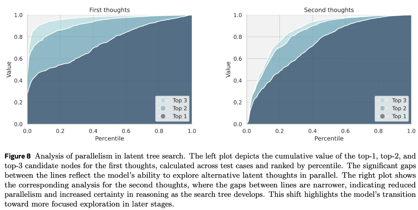 - latent space에서 reasoning하는 것은 명확한 결정을 미루고 reasoning step을 확장함으로써, 모델은 검색 트리의 최종 상태에 더 가깝게 탐색하여 올바른 노드와 잘못된 노드를 더 쉽게 구별할 수 있다.