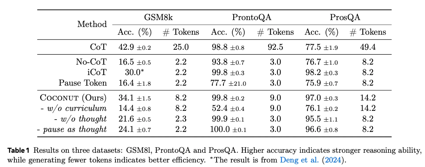 - COCONUT은 GSM8k 실험에서 iCoT와 Pause Token 대비 높은 성능을 보였다. CoT와 비교했을 때는 비교적 성능을 유지하면서 토큰 수를 줄일 수 있었다.