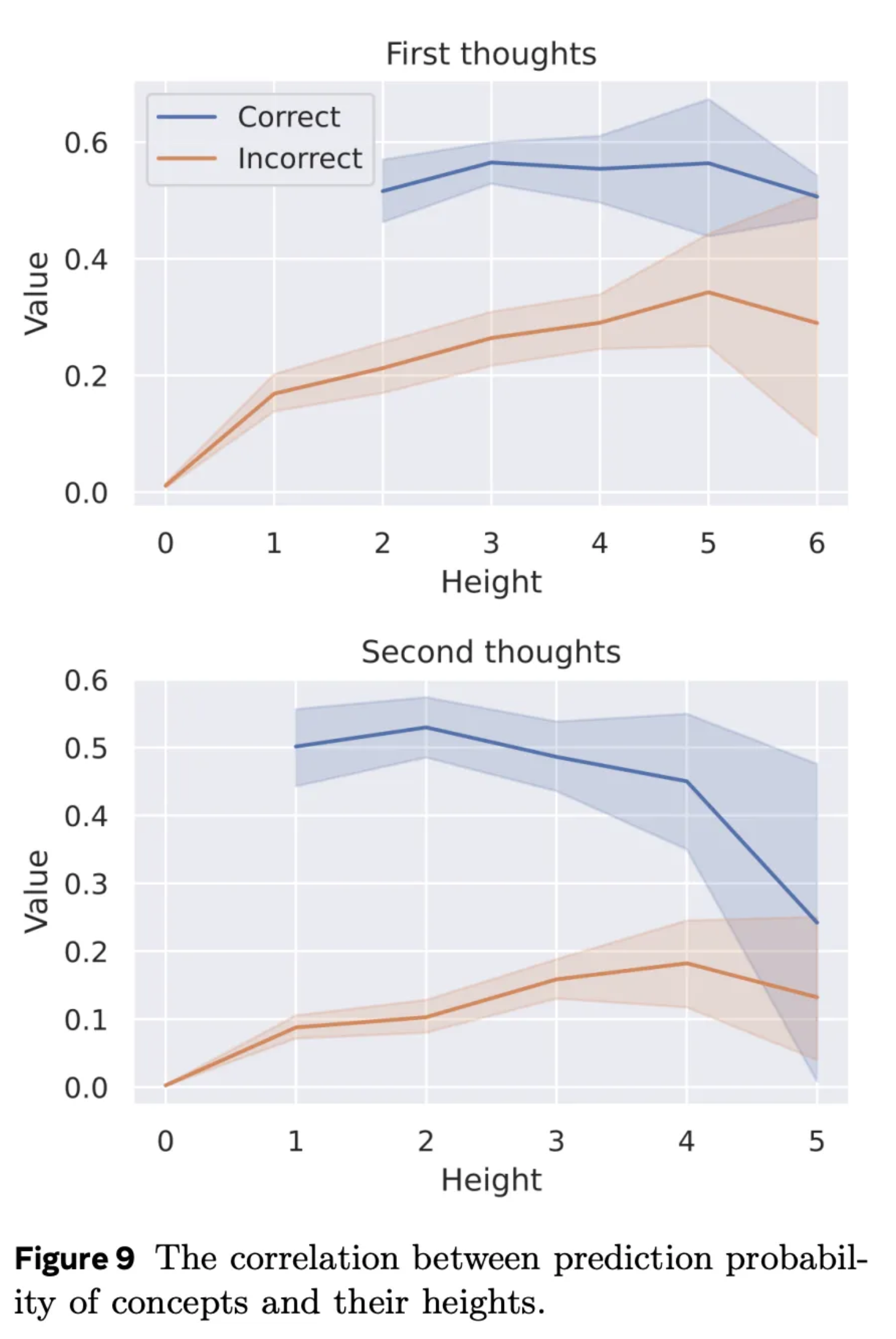 - 그림 9 : 테스트 세트 전반에 걸쳐 첫 번째와 두 번째 잠재 추론 단계 동안 모델의 예측 확률과 노드 "높이" 사이의 상관관계를 분석