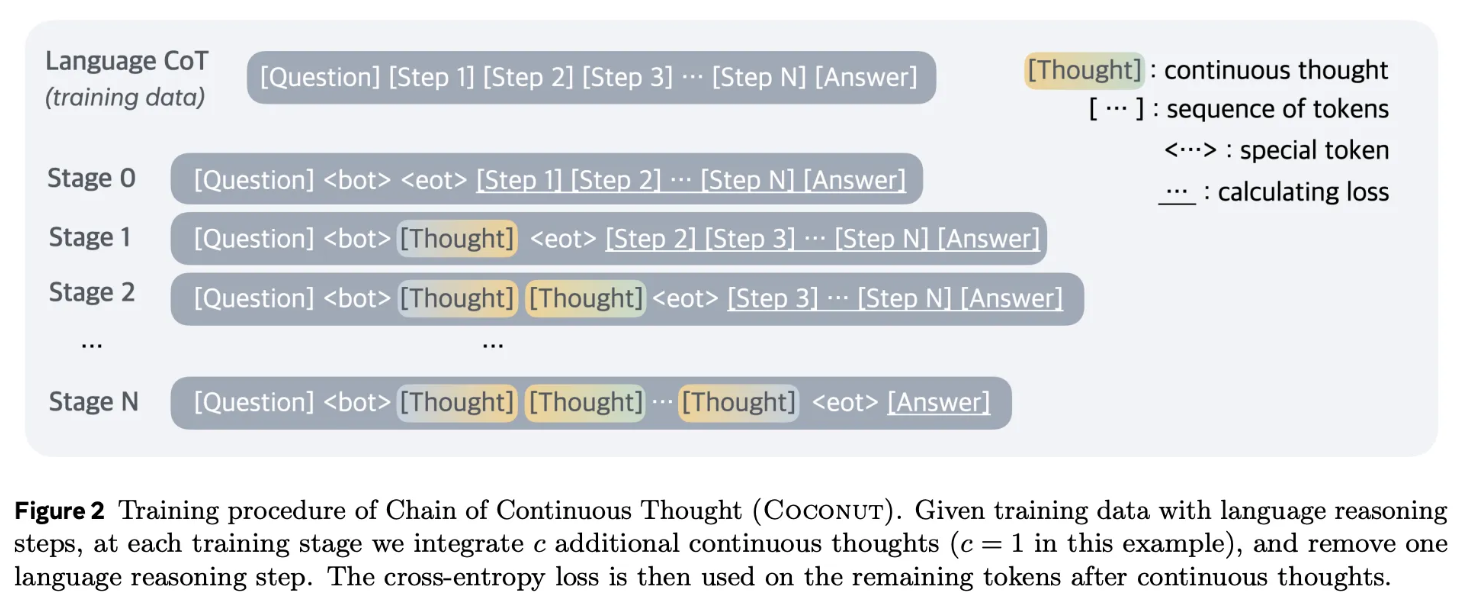 - [iCoT](https://arxiv.org/abs/2405.14838) 에서 영감을 받은 다단계 훈련 커리큘럼을 구현하여 CoT 데이터를 활용하여 연속적인 사고를 지도한다.